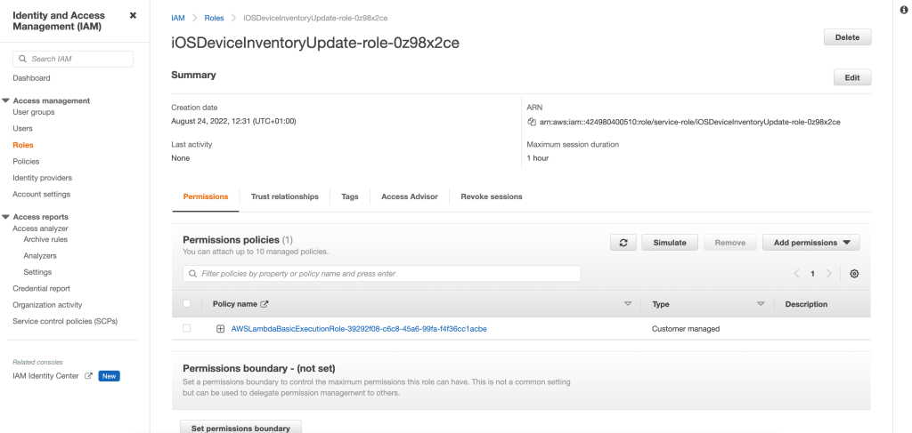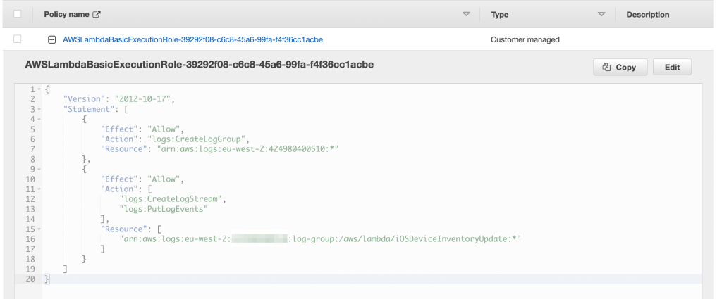 Next we can either create a new IAM role, assign those permissions and run the Lambda with it, or, for simplicity as this is just a demo, I’ll just edit the execution IAM role that was automatically created.