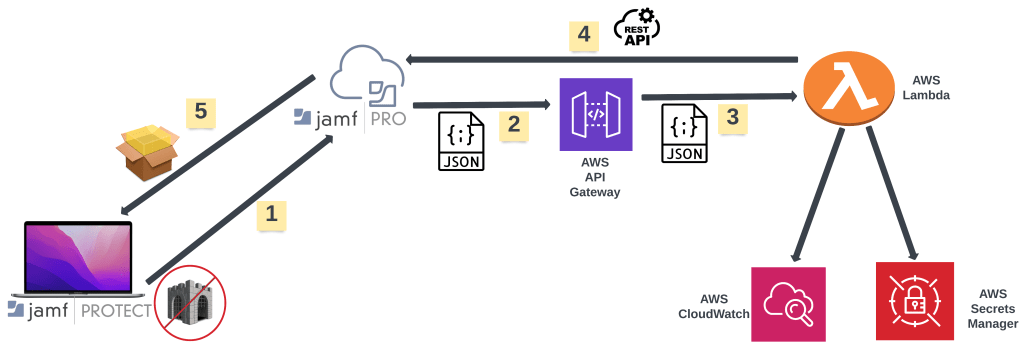 - Lambda iterate through the file, determine the event (Gatekeeper disabled) and makes an API call to Jamf Pro.