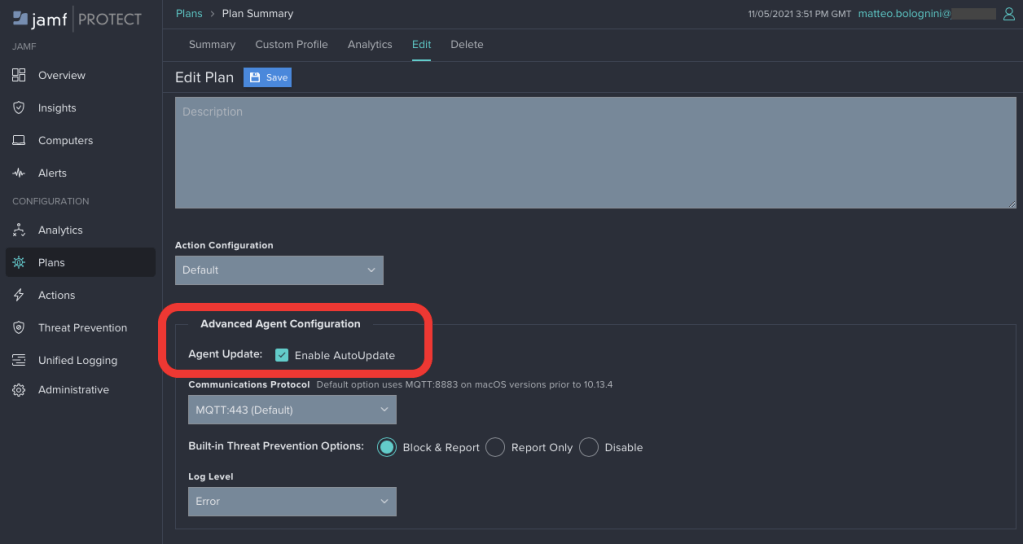 We will then go to Plans and either select an existing Plan or make a new one. If you’re making a new Plan, please refer to https://docs.jamf.com/jamf-protect/documentation/Plans.html