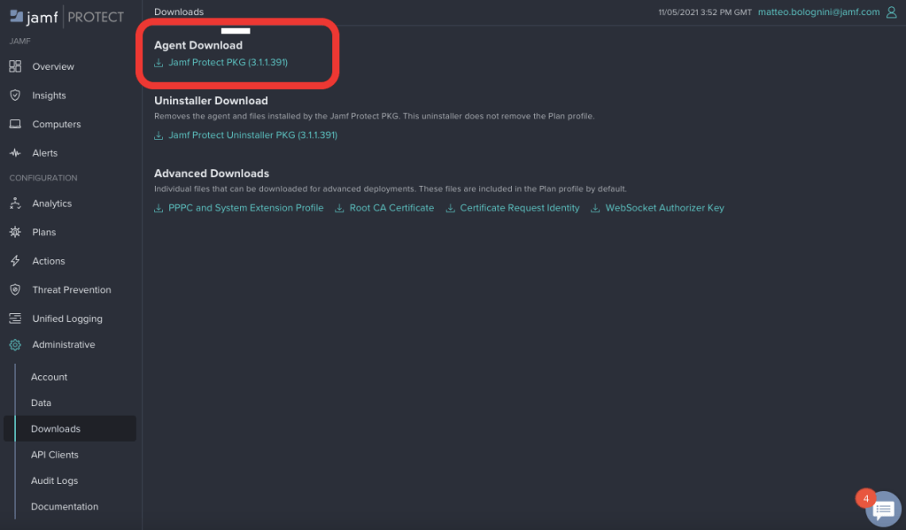 Lastly, we want to hop into Protect > Administrative > Downloads and download the installer:”