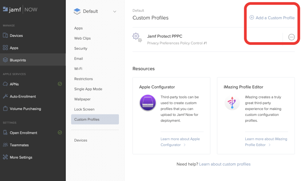 Now that we have both a pkg and the Configuration Profile downloaded from the Protect tenant, we can hop into Jamf Now console.