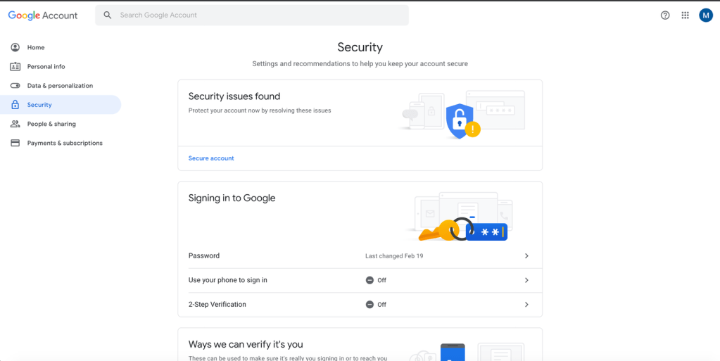 Let’s first check in our Google Account > Security > that Allow less secure apps is turned ON