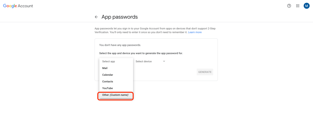 Once this is done we can go back into Security and create an App password following: https://support.google.com/accounts/answer/185833?hl=en
