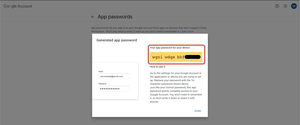 We will not get a 16 characters random generated password, let’s take note of the generated App Password as we won’t be able to recover it later