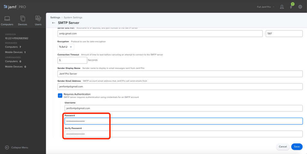 Once this is done we can go to Jamf Pro > SMTP Server and replace our current password with the randomized unique password we just obtained